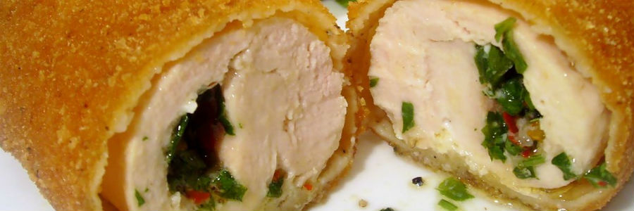 Retirar la pequeña tira de carne o filet mignon del pollo y colocar las pechugas entre plástico transparente o papel manteca untadas con un poco de aceite. Aplastarlas cuidadosamente con un mazo de madera y guardar en el frío. Para preparar la mantequilla al ajo, ablandar la mantequilla y añadir el ajo, perejil, sal y pimienta, mezclando todo bien. Colocar cucharadas de la mezcla a lo largo de una hoja de plástico transparente para cocina previamente engrasado o de papel manteca y darle forma de salchicha. Después, plegar los extremos y guardar la mantequilla en el refrigerador hasta que se endurezca . Realizar una pequeña abertura en la parte superior de cada pechuga y a continuación cortar a ambos lados de la misma con un cuchillo afilado, a modo de pequeño bolsillo. Deslizar una rodaja de mantequilla en cada hueco. Colocar un filete mignon de los que se retiraron del pollo sobre cada pechuga para que la mantequilla quede bien cubierta. Poner la harina condimentada, los huevos y el pan rallado en recipientes distintos. Rebozar el pollo con la harina, sumergiéndolo después en el huevo batido y finalmente pasarlo por el pan rallado. Cubrir por segunda vez con el huevo y el pan. Calentar el horno a 200° C. En una sartén honda calentar aceite suficiente para cubrir las pechugas hasta la mitad. Freir a fuego medio durante 6 minutos por cada lado hasta que doren. Pasarlas al horno sobre una rejilla y dejarlas unos minutos, así quedarán más crujientes. Si prefiere utilizar una freidora, calentarla a temperatura media, incorporar 2 pechugas y freirlas durante 12 minutos hasta que se doren. Sacarlas y dejarlas escurrir sobre papel absorbente arrugado. Dejarlas en el horno sobre una rejilla para que se mantengan calientes. Servir este plato con ensalada verde de lechugas orgánicas surtidas o endibias con aceite de oliva (vía Recetas gourmet)