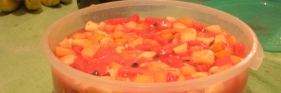Pelar la lechoza, sacar las semillas y cortar en cuadrados pequeños; hacer lo mismo con la piña, desechar el centro; hacer lo mismo con las manzanas, las naranjas, las uvas y la manga, las fresas cortarlas en cuatro. Mezclar bien.