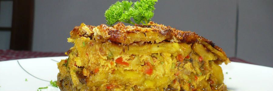 Se baten los huevos y se vierte una capa mìnima. Encima se coloca el guiso de chucho, otra capa de plàtano, otra de queso y una de melao de papelòn. Se repite el procedimiento hasta llegar al tope del molde y se finaliza con una capa de huevo.
