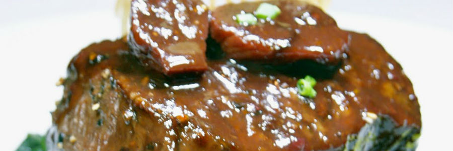 Cortamos el lomo en medallones, en la sartén o grill con gotas de aceite de oliva caliente. Sellamos el filete y cocinamos por 8 minutos ya sazonado. En otra olla, hacemos una reducción entre el vino oporto con el charlot picado con tomillo. Se hace una especie de infusión que se reduce. Luego colocamos la demiglace, la sazonamos y la pasamos sobre un colador chino. Volvemos a colocar la salsa en una olla y con la mantequilla. (vía Red crab)