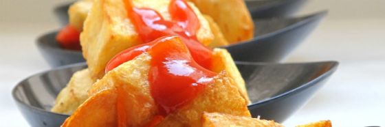 Pelar las patatas y cortarlas en trozos medianos. Lavarlas, secarlas bien y freírlas en abundante aceite caliente, a fuego lento, hasta que las patatas estén doradas. Escurrir sobre papel absorbente de cocina y reservar caliente. Aparte, preparar la salsa rehogando los tomates rallados en un poco de aceite. Añadir el vinagre, la harina y el pimentón picante. Sazonar, mezclar bien y verter la salsa sobre las patatas. (vía A tapear)