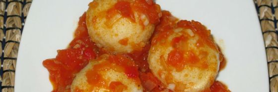 Para la salsa, sofria la cebolla, pimenton y ajo por 7 minutos. Agregue el tomate y cocine hasta que el tomate se haga bien. Apaguelo, tapelo y deje reposar por unos 10 minutos. Luego paselo por una licuadora y sazone con sal y pimienta al gusto. Agregue la salsa a los bollos cocidos en una olla y si quiere calientelos un rato para que agarren el gusto de la salsa. (vía Recetas gourmet)