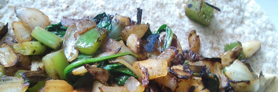 Saltear las espinacas, la cebolla y champiñones en el aceite de oliva, salpimentar y servir sobre una tortilla previamente calentada, agregar el queso y la reducción, enrollar y servir caliente. (vía Cocina33)