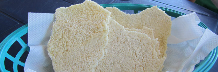 No. 4 Casabe chorriao. Después de hacer la torta de casabe se prepara una mezcla de almidón con leche y azúcar hasta que dé el punto. Luego se chorrea la torta con esta mezcla en el budare, se deja reposar y se pica para guardar o almacenar.