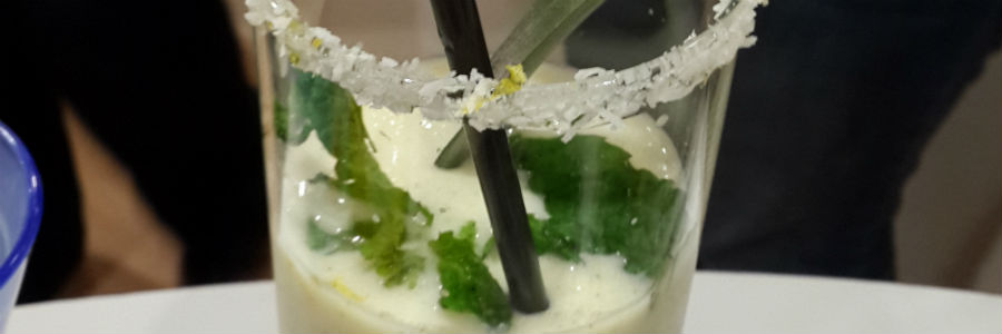 Prepare un vaso largo de la siguiente manera: mezcle en un bol pequeño la ralladura de limón y el coco rallado hasta que los aceites de la naranja hayan impregnado al coco. Moje el borde del vaso con crema de coco y pase por la mezcla de coco y naranja hasta que se forme una capa en el borde.