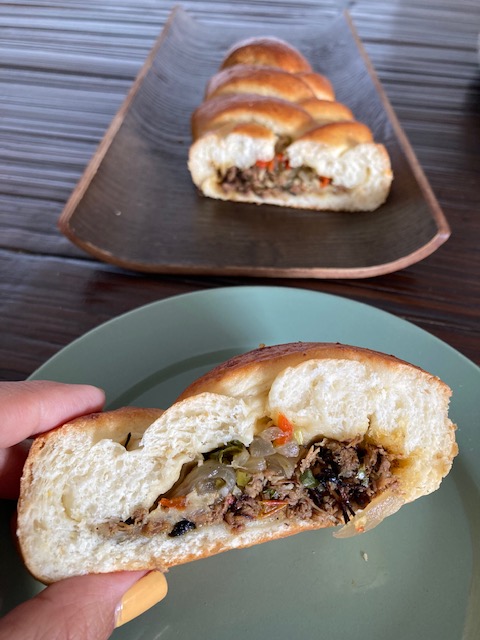Nuestro tradicional pan de Navidad, vestido con la reina de las masas francesas, relleno con jamón y tocineta ahumada, aceitunas verdes rellenas de pimentón y pasitas, y un toquecito de papelón rallado.